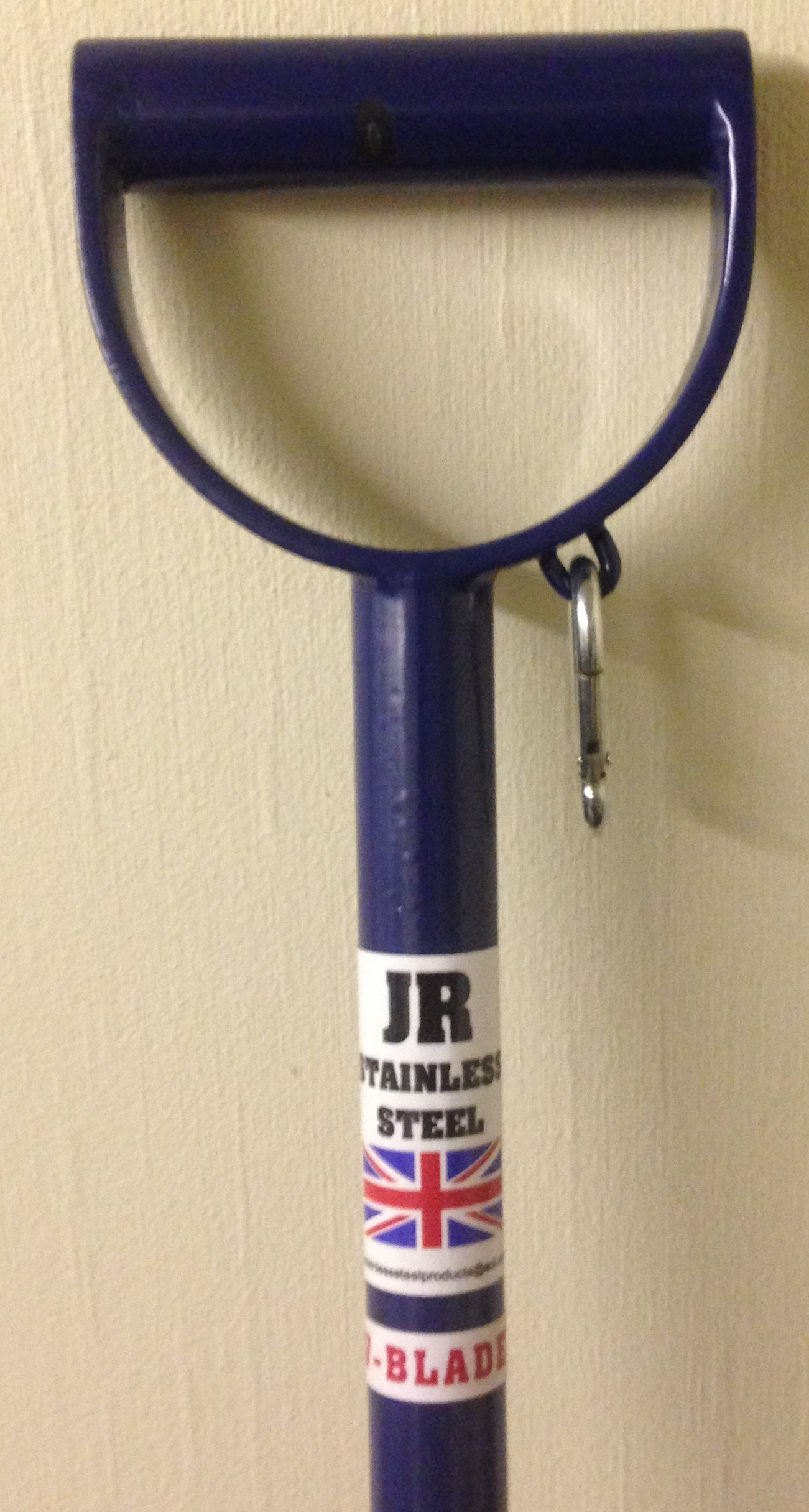 Shown here is a personalised & very blue stainless steel spade, I had this made to my specifications, and being a jammy-bar-steward my daughter purchased this for me as a Christmas gift, I was so lucky & it has worked so well; so well, in fact, I went on to have another two customs spades made, although I did not like the second one, so that was sold on, with the third one being just right, so, back to the first one which is shown here, as you can see it is blue, being the first custom i had built, i wanted it in red, but it ended up blue, oh well…Three foot long in proper money or 900cm long in new money, with a reinforced lower part of the stem where the blade meets the handle, and properly welded, throughout, i’m all for a few gizmos and gadgets, and the idea of two welded staples, to attach a Carabiner Clip which in turn will allow a threaded sling, so as it can be carried on the shoulder leaving the hands free, and walking over rough terrain to get to a site anything to free up your hands seemed a good idea “but” not on the handle where everyone else has there’s,