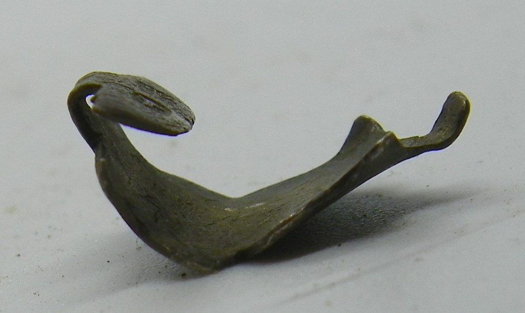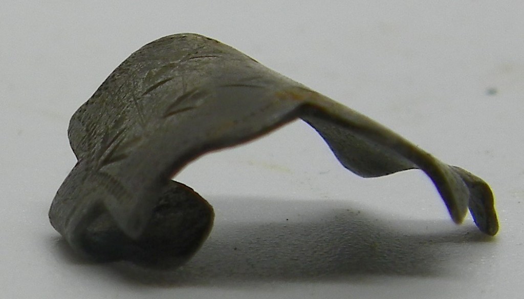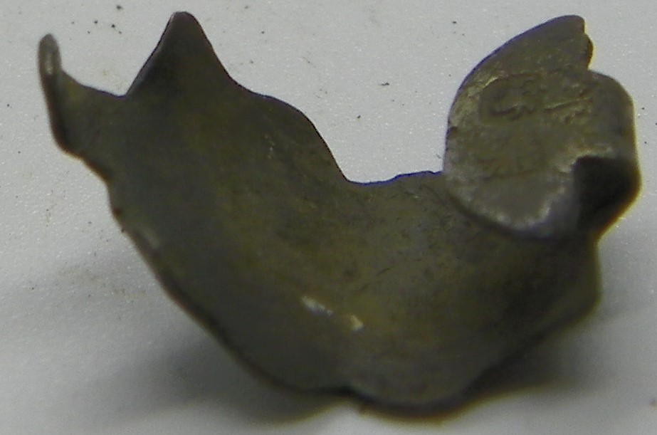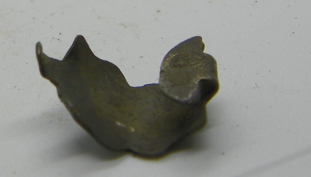 An uncleaned & small silver clog clasp, with bird type footprints as a decoration, although very bent, this might straighten out with a little bit of heat… There is a Duty Mark in the form of the monarch’s head on this piece of imported silver, which clearly puts this piece of foreign silver somewhere between 1786 – 1821 in the Reign of George 111…