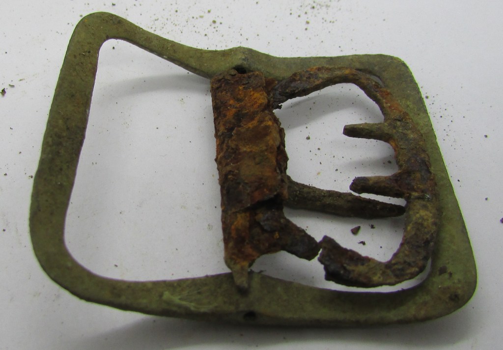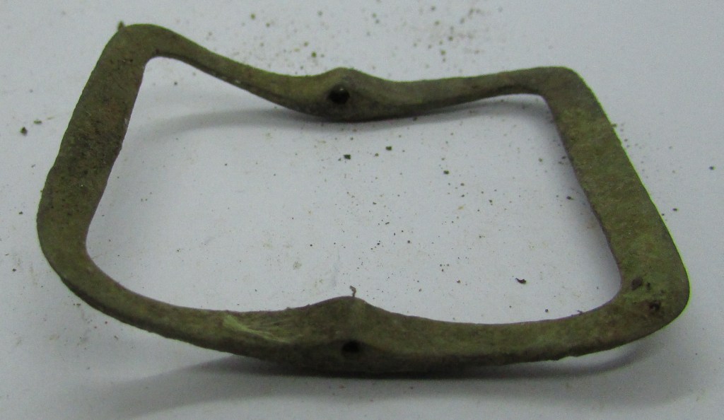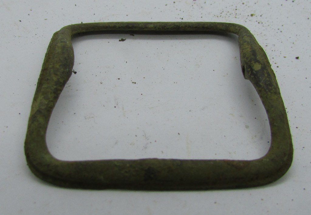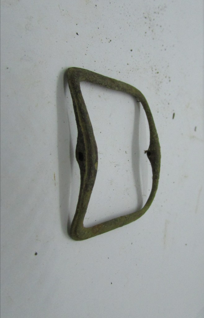 This was found a while ago, it is an incomplete copper-alloy Shoe Buckle, dating from early to late 1700’s, although i would say this would be from the 1750’s… This type of Shoe Buckle seems to be one of the most popular styles, lasting nearly one hundred years… Moulding marks flow around the frame, creating an upper and lower section to the frame… This style seems to fit into the 1730’s to 1750’s when the shoe buckles started to increase in size, and yet were still moulded…