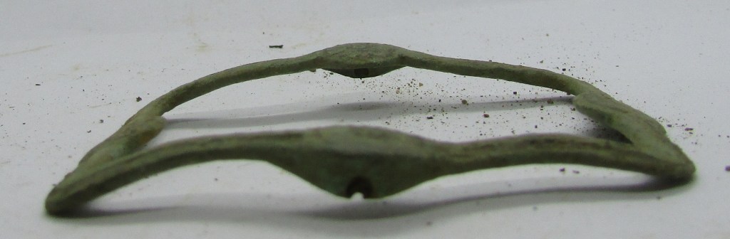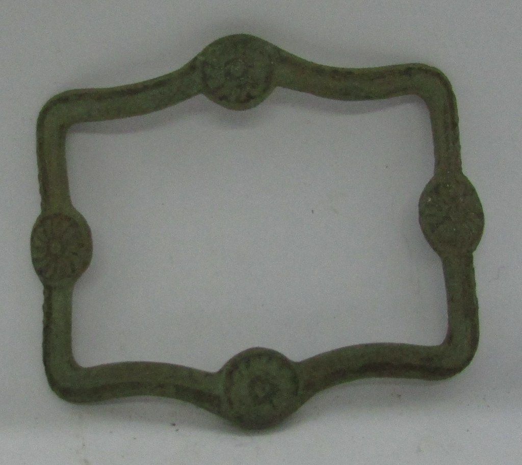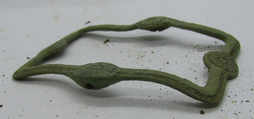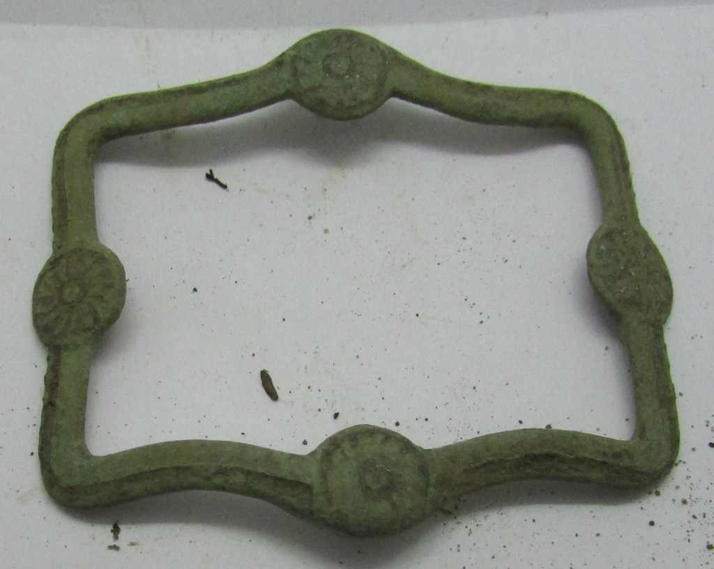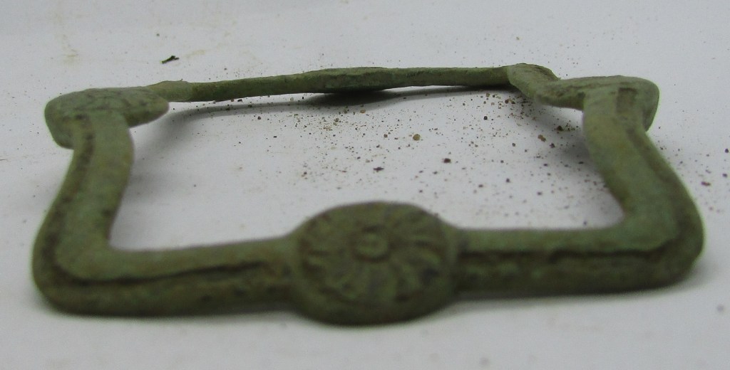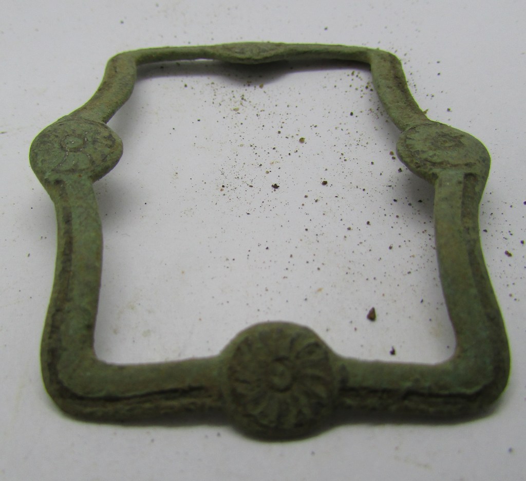 Rectangular, Cast Copper Alloy, Convex Shoe Buckle with a drilled frame to accept the iron or steel chape, with symmetrical moulded rosettes decorating the centres of each bar at the ends and sides, small damage to one side, yet the frame is in good condition, with the centre moulded rosettes on the sides, covering the spindle holes…