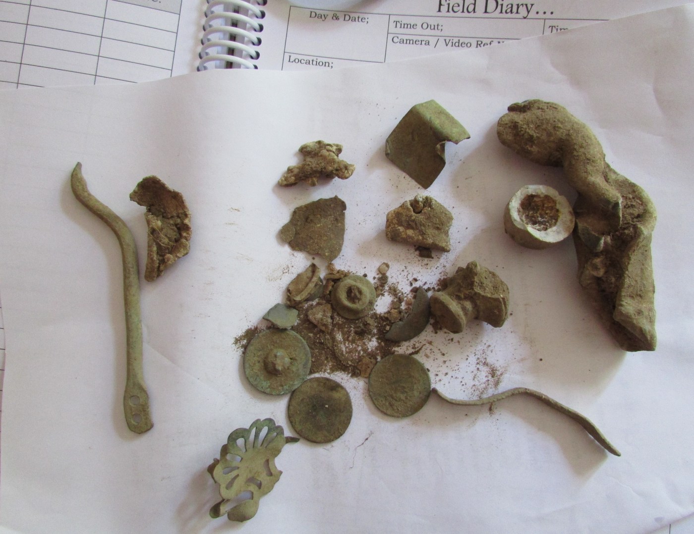 T2 pays a visit to more solid ground on Sunday with the dig meagre finds shown in the photos, top right in the photo is a sphere, which has been broken exposing a sponge fossil, followed by mostly scrap, a couple of pre-decimals, furniture fitting, and another object which i love finding, this one has two holes at one end…