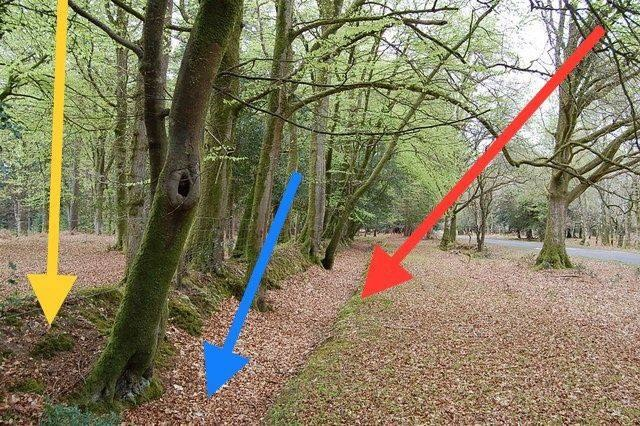 Yellow arrow → The woodbank, made from the soil dug out of the ditch.