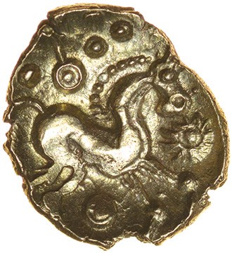 Billericay Cogwheel. Sills British Ld2, class 1, dies 2/2 c.50-30 BC. Gold quarter stater. 10-13mm. 1.11g. Wreath band with inverted leaves and two solid opposed crescents, three outline crescents forming smiling face below./ Horse galloping right, beaded mane, pellets and ringed-pellet above, pellet-boss below, ‘cogwheel’ before. ABC 2371, VA−, BMC−, DK 438, S−. CCI 13.0514 (this coin). EF, rose gold, sharp strike, great grinning face, fabulous horse. Ex John Follows collection. Found Little Easton, near Great Dunmow, Essex, November 2012. EXCESSIVELY RARE only three others recorded.