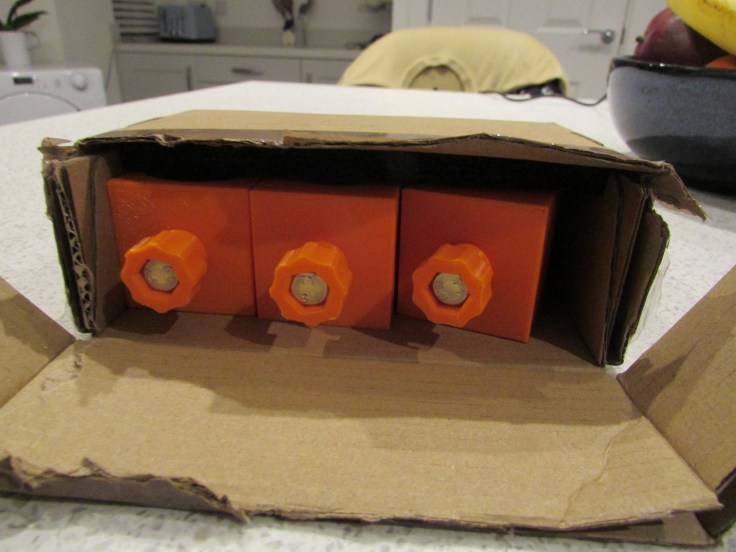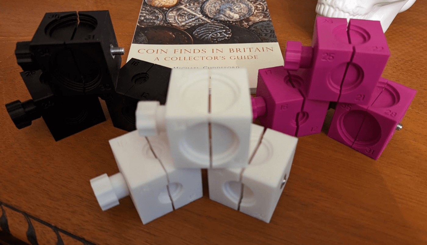 Each block as a set takes about twelve hours to print with various colours available, apart from my orange set there are white, fuchsia and black filaments also available, if ordering do not expect an instant delivery as your colour might not be available and you might have to wait for it to be printed, but that’s a short wait considering, what you are actually getting, as an example mine was out of stock on Wednesday it was ordered, it was printed on Thursday, then it was cleaned assembled and posted on Friday, with a very neat and tidy package arriving on Saturday morning, it was opened to reveal a very well packaged and secure coin cubes, so now, i was the proud owner of a set of coin cleaning blocks, and the first thing i did was to see if a rather battered Saxon sceat which was more oval than round could be held in place, and i was not disappointed, by design or dint one of the blocks has oval shaped seats in preference to the standard round…