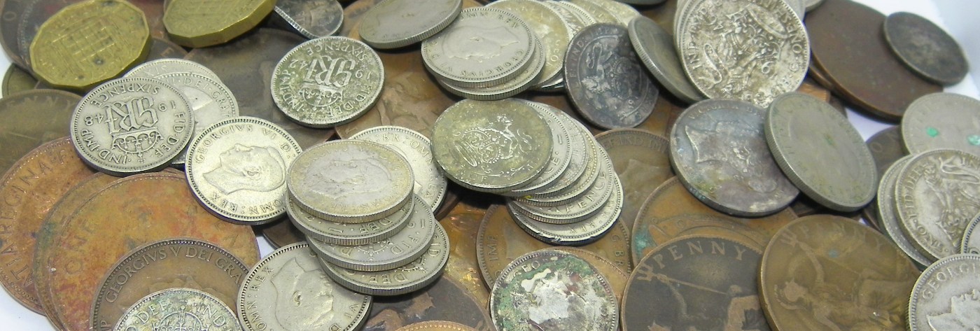 Centre: tails of coins – Edwardian silver threepenny bit, silver sixpence, silver shilling, silver two shillings (a florin) and silver half crown. The copper coins are for scale.