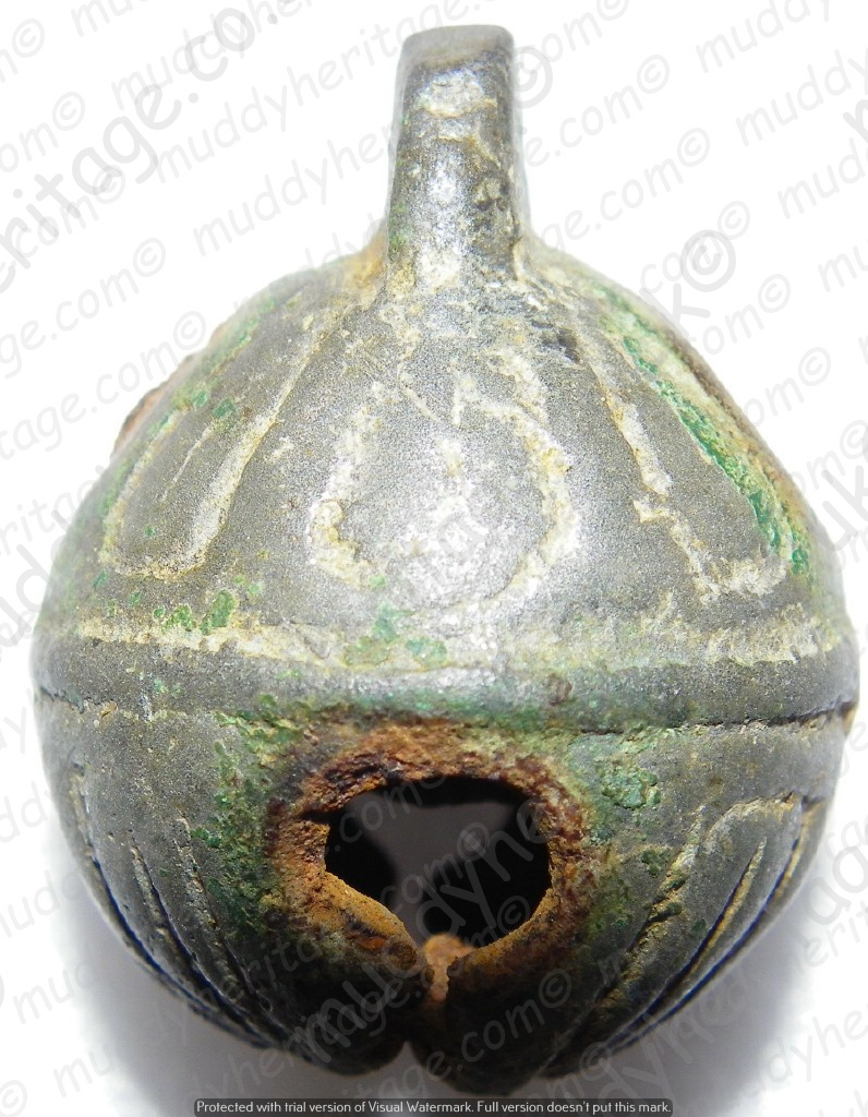 | Fig.2 Copper-alloy crotal bell 13th–14th century | Bells of this type were produced only until about the end of the 13th century. (Cf. MoL, Dress Accessories, 1668-1671; Mitchiner, Medieval & Secular Badges, 356.)Cast copper-alloy bells based on the same principle are probably contemporaneous, or very nearly so. Their integral suspension loops are frequently at the end of an extended shank, and a number of them have been found attached to harness mounts – perhaps their principal use. Bells of this type probably date from about the mid-13th to the mid 14th century. (Cf. Read, Metal Artefacts of Antiquity, 465-467.) | |