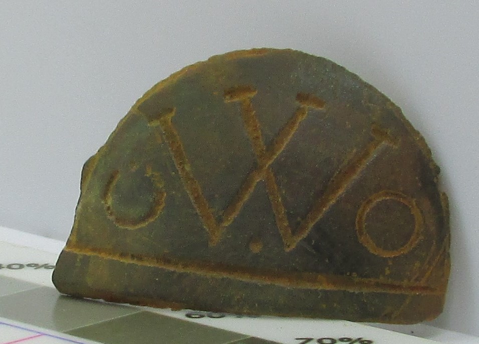 | It is estimated that about 170 bell foundries have operated in Britain since the middle of the 13th century, varying in size from cottage industry operations to major businesses. The number in operation at any one time rose steadily from approximately five in 1250 to a maximum of nearly sixty around 1700, and then progressively declined to just two at the beginning of the 21st century. Not all bell foundries will have made crotal bells, of course, but the scope for errors of attribution will be apparent from the statistics.Where initials occur, they may be on one side of the sound bow, or divided by it. Where they are on either side of the bow, they may be orientated at 0 degrees or 180 degrees to each other (as the RW example illustrated). In some cases they are neat and may originate from the pattern. In others they are crude, and appear to have been engraved on the bell itself. | Fig.19 18th century crotal bell with the initials WG (William Gwynn ?) on one side and a founder’s hammer on the other. | |
