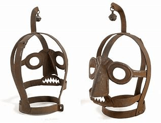 Here is another strange purpose these bells were used for, below right is a “scolds bridal” and on top was a crotal bell, so the perpetrator of this deed could hear where the woman was…