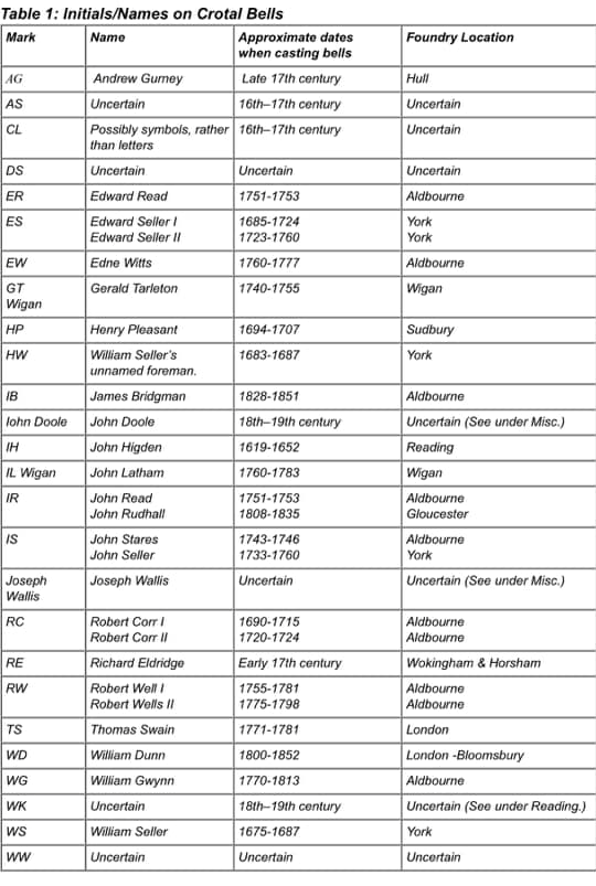| Table 1: Initials/Names on Crotal BellsMarkNameApproximate dates when casting bellsFoundry LocationAG Andrew Gurney Late 17th centuryHullASUncertain16th–17th centuryUncertainCLPossibly symbols, rather than letters16th–17th centuryUncertainDSUncertainUncertainUncertainEREdward Read1751-1753AldbourneESEdward Seller I Edward Seller II1685-1724 1723-1760York YorkEWEdne Witts1760-1777AldbourneGT WiganGerald Tarleton1740-1755WiganHPHenry Pleasant1694-1707SudburyHWWilliam Seller’s unnamed foreman.1683-1687YorkIBJames Bridgman1828-1851AldbourneIohn DooleJohn Doole18th–19th centuryUncertain (See under Misc.)IHJohn Higden1619-1652ReadingIL WiganJohn Latham1760-1783WiganIRJohn Read John Rudhall1751-1753 1808-1835Aldbourne GloucesterISJohn Stares John Seller1743-1746 1733-1760Aldbourne YorkJoseph WallisJoseph WallisUncertainUncertain (See under Misc.)RCRobert Corr I Robert Corr II1690-1715 1720-1724Aldbourne AldbourneRERichard EldridgeEarly 17th centuryWokingham & HorshamRWRobert Well I Robert Wells II1755-1781 1775-1798Aldbourne AldbourneTSThomas Swain1771-1781LondonWDWilliam Dunn1800-1852London -BloomsburyWGWilliam Gwynn1770-1813AldbourneWKUncertain18th–19th centuryUncertain (See under Reading.)WSWilliam Seller1675-1687YorkWWUncertainUncertainUncertain | ||
