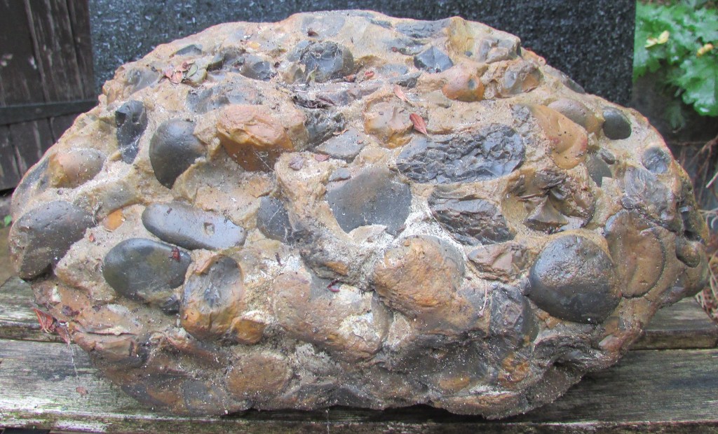 Shown here are my personal collection of Pudding-stones, & all found in the North of Essex… not far from the Essex & Hertfordshire borders…. one is the typical caramel-coloured pudding stone, the other is a light coffee colour whilst the third i had to have checked out, as a cross-reference because it represents silica the same colour as concrete, but it is a lighter and more harder conglomerate…