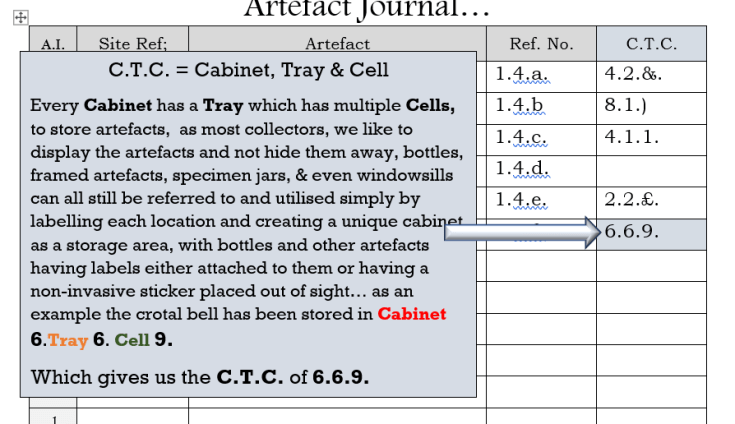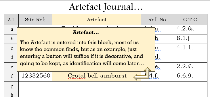 As an example, you have found a brass ring, there is plenty of space to write into the Artefact Block, brass ring, with markings, then a week later, after it has been positively ID, put beside it, bronze ring mid to late Roman, with a Che-Ro sign, then pop an abbreviated date beside that of when it was ID, & on your field ticket you can write your positive ID, for future reference…